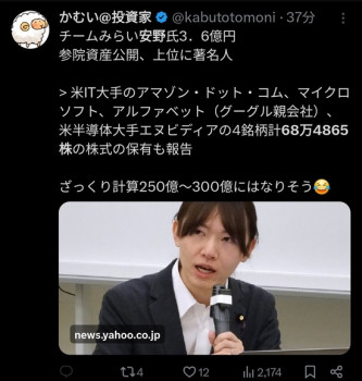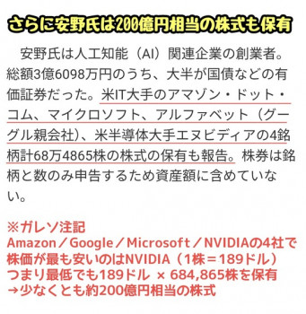 安野氏は人工知能(AI)関連企業の創業者。総額3億6098万円のうち、大半が国債などの有価証券だった。米IT大手のアマゾン・ドット・コム、マイクロソフト、アルファベット(グーグル親会社)、米半導体大手エヌビディアの4銘柄計68万4865株の株式の保有も報告。株券は銘柄と数のみ申告するため資産額に含めていない。
