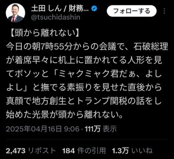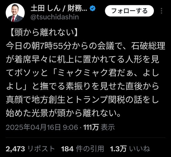 今石破「ミャクミャク君が愛おしくて愛おしくて仕方がない。ミャクミャク君を見るとどうしても笑顔になってしまう。」