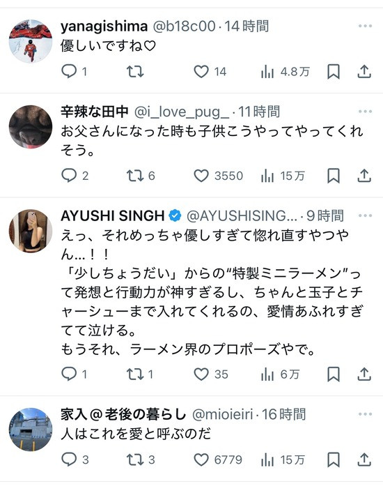 気前のいい奴やなワイもよく嫁にラーメン一口あげるけどいつもおいおい一口でかすぎやろざけんな😡って言ってるわ