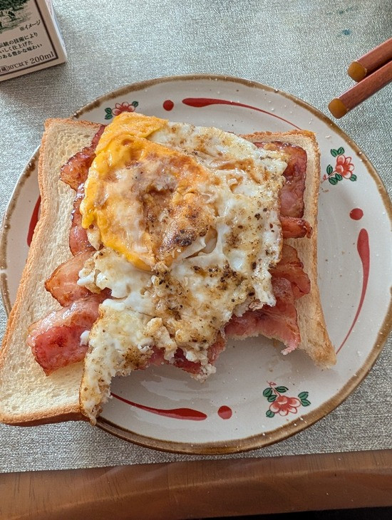カリっカリに焼いた食パンの上に塩気の効いたベーコンと味を包みこむ目玉焼き。