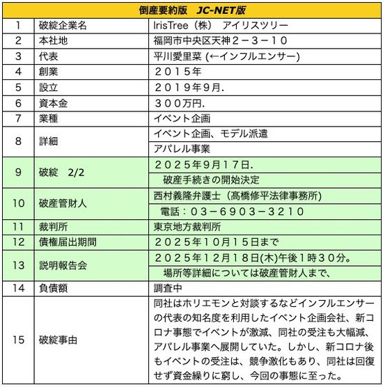 倒産情報サイト「JC-NET」の倒産要約版によると、平川氏が代表を務めるIrisTree(アイリスツリー)は2025年9月17日、東京地方裁判所より破産手続き開始決定を受けた。