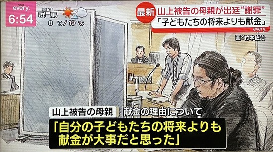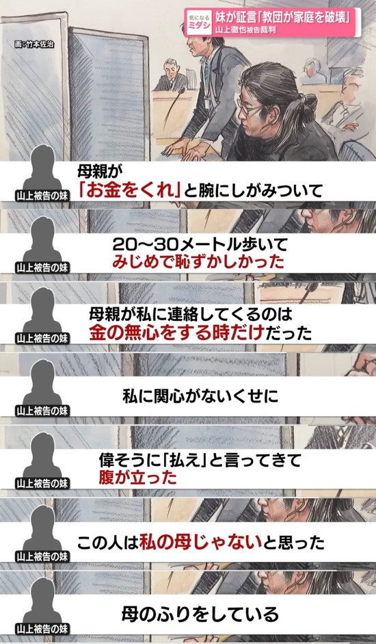 安倍晋三元首相銃撃事件で殺人罪などに問われた山上徹也被告(45)の裁判員裁判第9回公判が19日、奈良地裁で開かれ、被告の妹の証人尋問が行われた。被告らの母親は世界平和統一家庭連合(旧統一教会)に1億円を献金し、家庭が困窮。