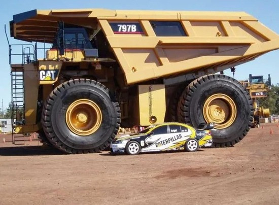 世界最大のダンプカー、全長15m、最大積載時の重量はなんと700トン、最大スピードは70kmに及ぶ。