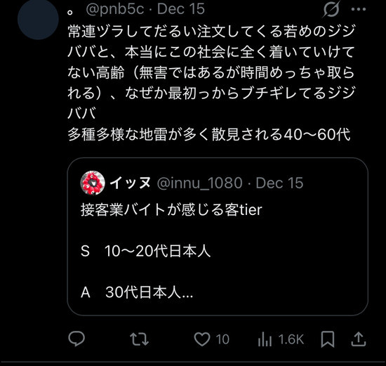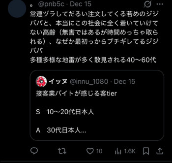 バイトやってた頃クレームくるのは団塊辺りと30代の女しかいなかった