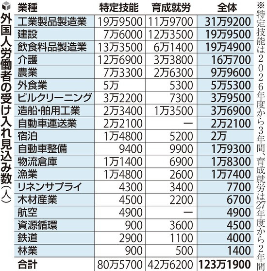 外国人労働者の受け入れ、28年度末までに123万人の上限案…技能実習に代わる「育成就労」は42万人見込む