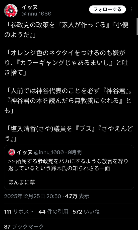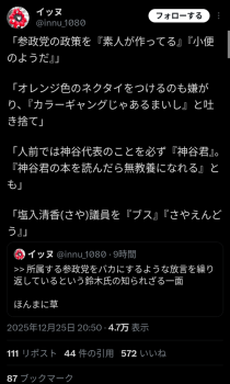 こいつ元々国民民主とかにいて生え抜きじゃないからな。議員になりたいから参政党に入っただけなんやろ