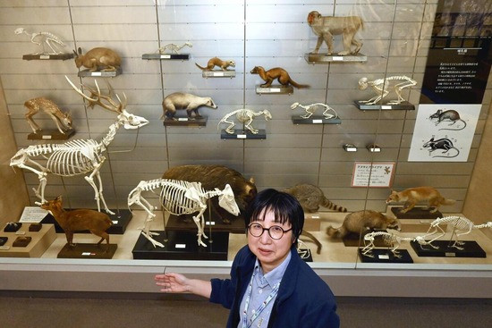 千葉県内に生息する哺乳類の標本展示の前で「クマはいません」と説明する下稲葉さん(19日、千葉市中央区で)