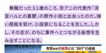 被告は30代になって、京アニの映画に感動したことをきっかけに、自ら小説を書いて京アニ大賞に応募するが、入選は果たせなかった。もともと、被告は自分の能力を過大評価するタイプのため、渾身の作品が優秀作として選ばれなかったには大いに傷つき、不満を募らせる。そして、被告は自分の能力不足を棚上げにして、恵まれない人生は京アニが認めてくれなかったからだと、他責的にとらえている。応募作が選ばれなかったことを「闇の人物」のせいにするという妄想がはじまり、自分の作品の中にちりばめられた優れたアイデアの一部を京アニに盗まれたと考えるようになる。そのようにすることで、自己肯定感が得られる上、盗作した京アニへの恨みが放火殺人事件を起こす犯行動機として合理的に形成されたと主張するに至ったではないか。