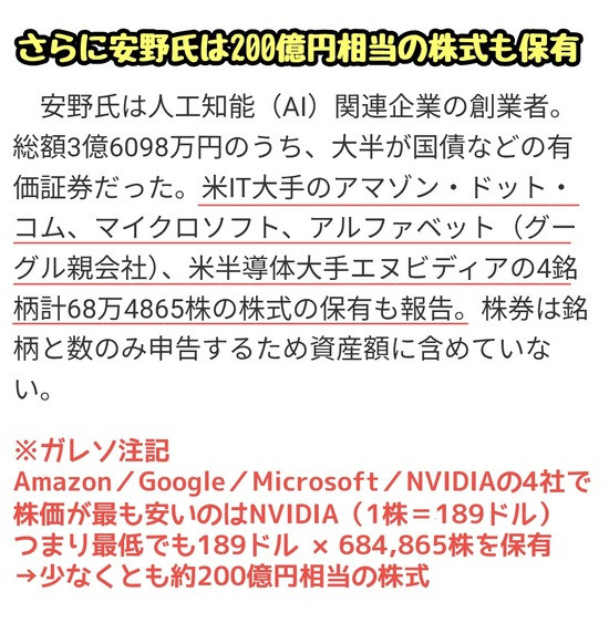 安野氏は人工知能(AI)関連企業の創業者。総額3億6098万円のうち、大半が国債などの有価証券だった。米IT大手のアマゾン・ドット・コム、マイクロソフト、アルファベット(グーグル親会社)、米半導体大手エヌビディアの4銘柄計68万4865株の株式の保有も報告。株券は銘柄と数のみ申告するため資産額に含めていない。