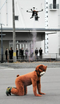 消防本部近くの広場ではデモンストレーションがあり、着ぐるみを着たクマ役に向かって飛行したドローンが上空から赤く色づけした練習用のスプレーを噴射した。