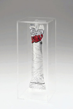 美術品として鑑賞することを前提に、開封できない透明のアクリルボックスに収納。昨年3月に1本10万円(税別)で限定50本を販売すると、すぐ完売した。パッケージに印刷された線画は松山さんが描いたが、それ以外は普通のうまい棒と同じだという。