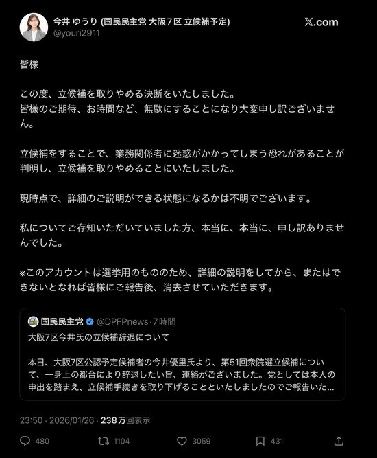 今井氏は大阪府出身で、京大医学部人間健康科学科を卒業。大学在学時からモデルとしても活動。23日には、自身のX(旧ツイッター)を更新し「はじめまして。大阪7区から立候補を予定している、今井ゆうりと申します」とした上で、写真を公開。「【負担の世代から、挑戦の世代へ】これは、今回の選挙に向けて、私が大切にしたいと決めた言葉です」と、長文で衆院選に挑む意気込みをつづっていた。