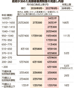 政府が検討する医療保険制度改革の関連法案の全容が3日判明した。医療費の自己負担を抑える「高額療養費制度」の患者負担額を少なくとも2年ごとに検証する規定を創設する。政府は高齢化や治療の高度化で膨らむ医療費の総額抑制を目指しており、自己負担額が定期的に引き上げられる可能性がある。負担額を決める際は長期間治療する患者の家計への影響を考慮すると明記した。