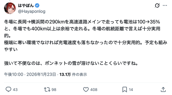デカいバッテリー積んでるんだから熱をバッテリーの温度コントロールは余裕なのに寒さばかり言われる