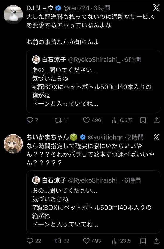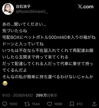 声優の白石涼子さんが2026年4月2日にXで、宅配で頼んでいるペットボトル40本入りの箱が宅配BOXに入れられ、持ち運べない状態であると明かし、ネット上から賛否両論を集めている。