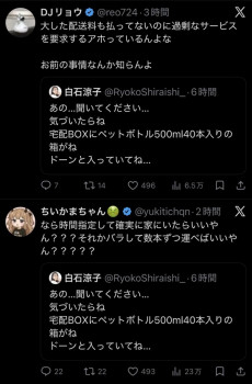 白石さんによると、「配達時間とか事前に連絡ない」とのことで、「事前に対処できることは何もない」と明かし、「ってか初めてかも今までの人はそんなことなかったのにな…」「重量超過で宅配BOX入れられないとかでいつも持ち帰ってたはずなのに」とつづっていた。