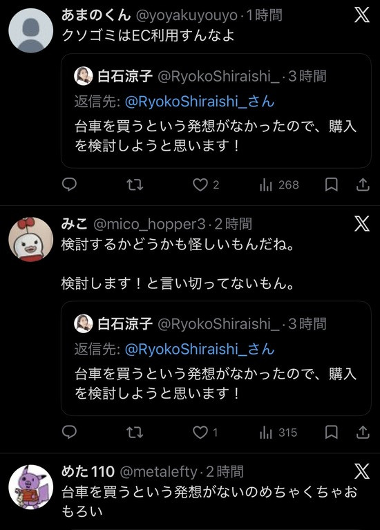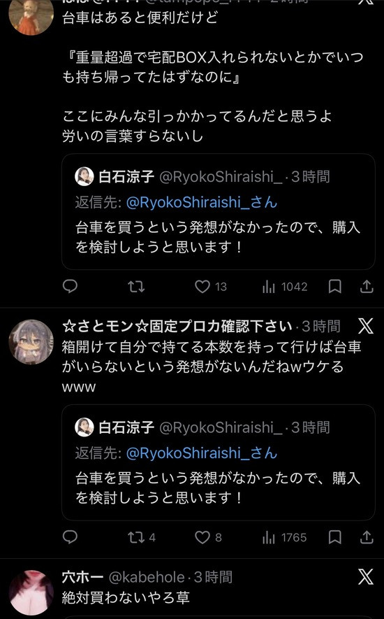 この一連のポストに白石さんのもとには、「うちもよくやられるので、台車を買いました」「基本、玄関で受け渡すまでが配達員さんの仕事だもんね」という共感の声が集まった。