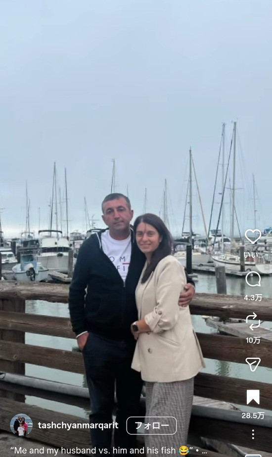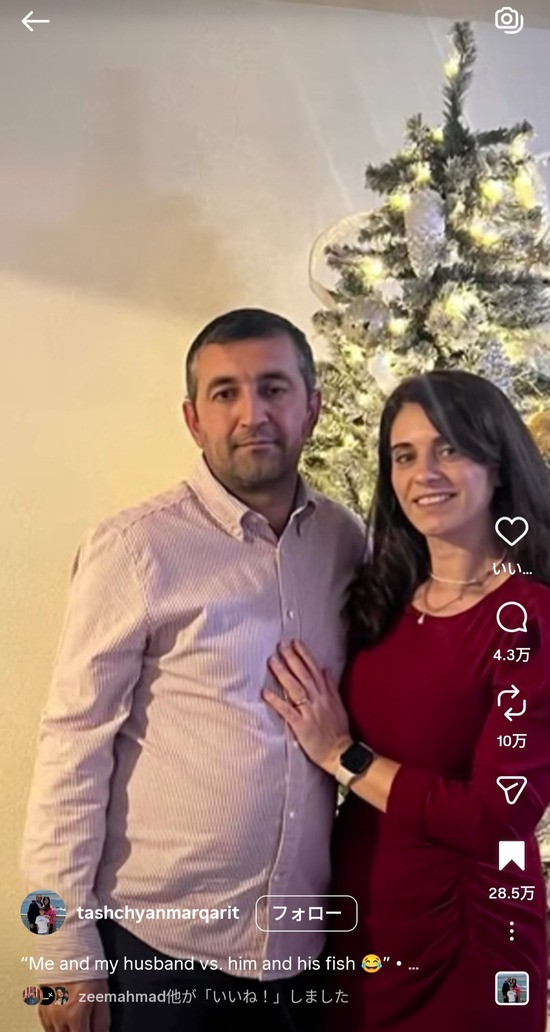 「私と夫 vs 魚と夫 😂」ってタイトル付いてるやん