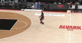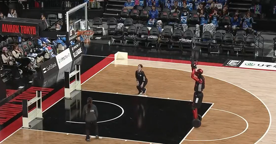 当日の試合では、背番号97を付けたアルバルク東京仕様のユニフォームを着用し、2輪でバランスを取りつつ、観客を煽りながらコート上を移動した。